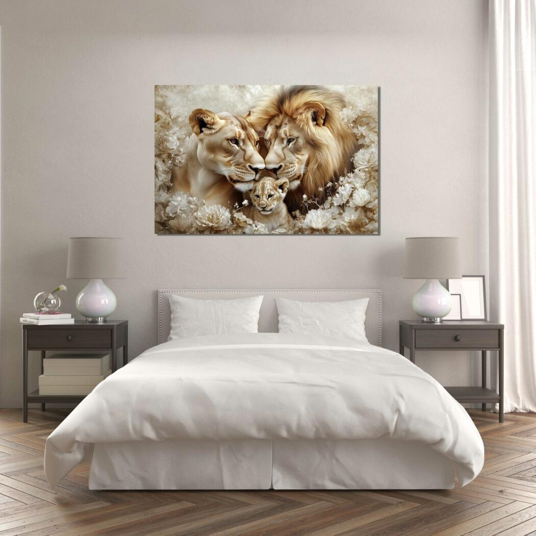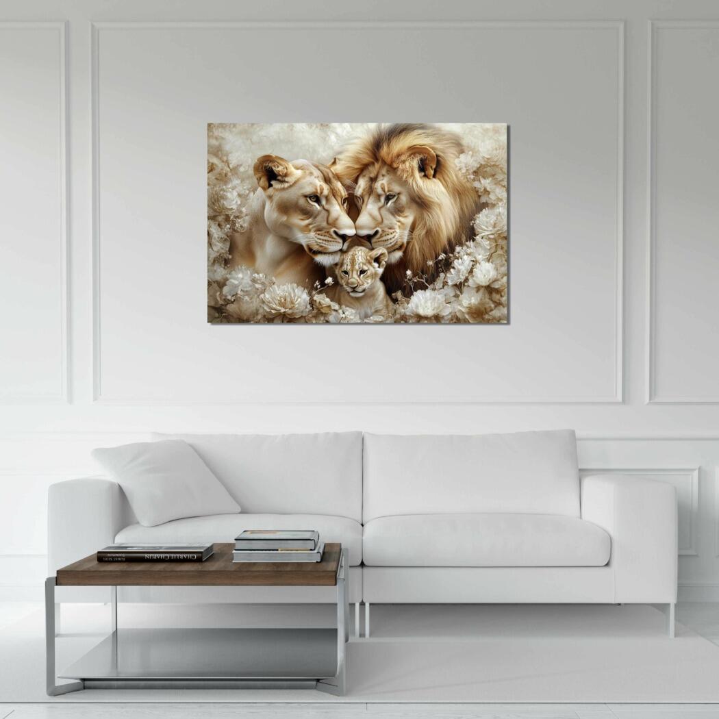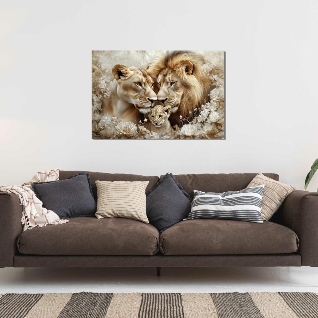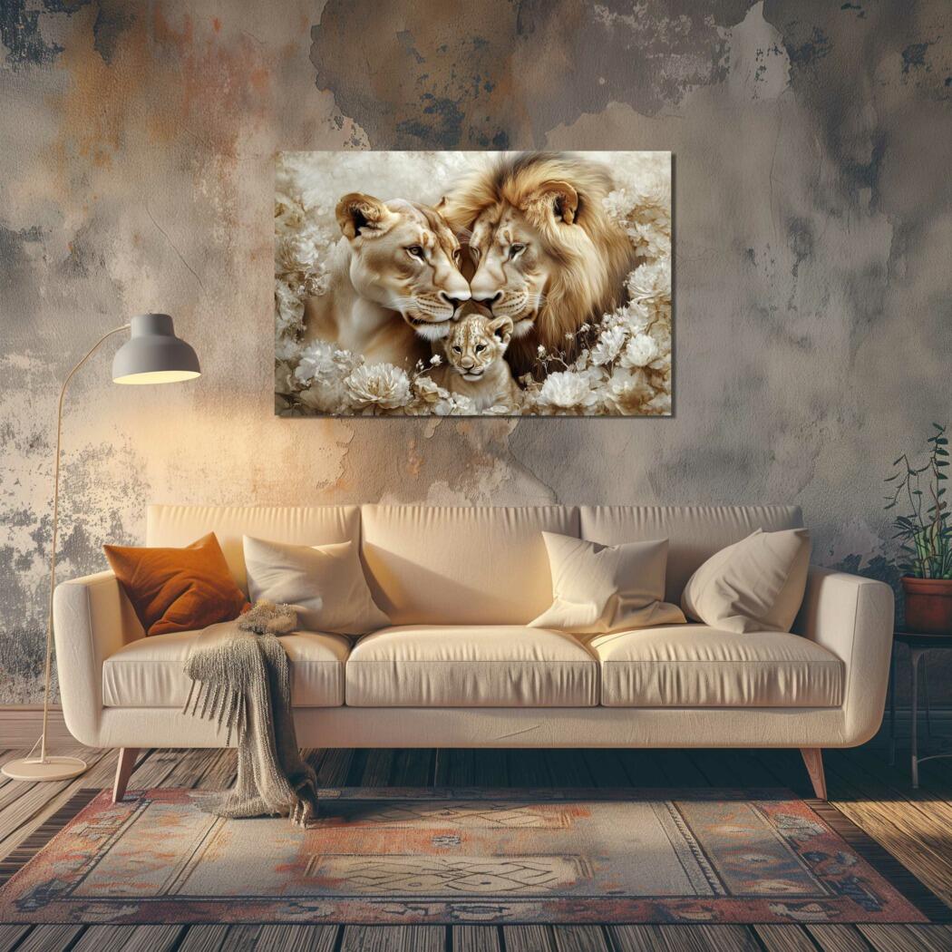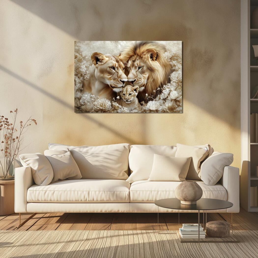 Glasschilderij – Exclusive – Liggend – De Ochtendwacht Leeuwenfamilie 1 Welp – (Japandi Stijl)