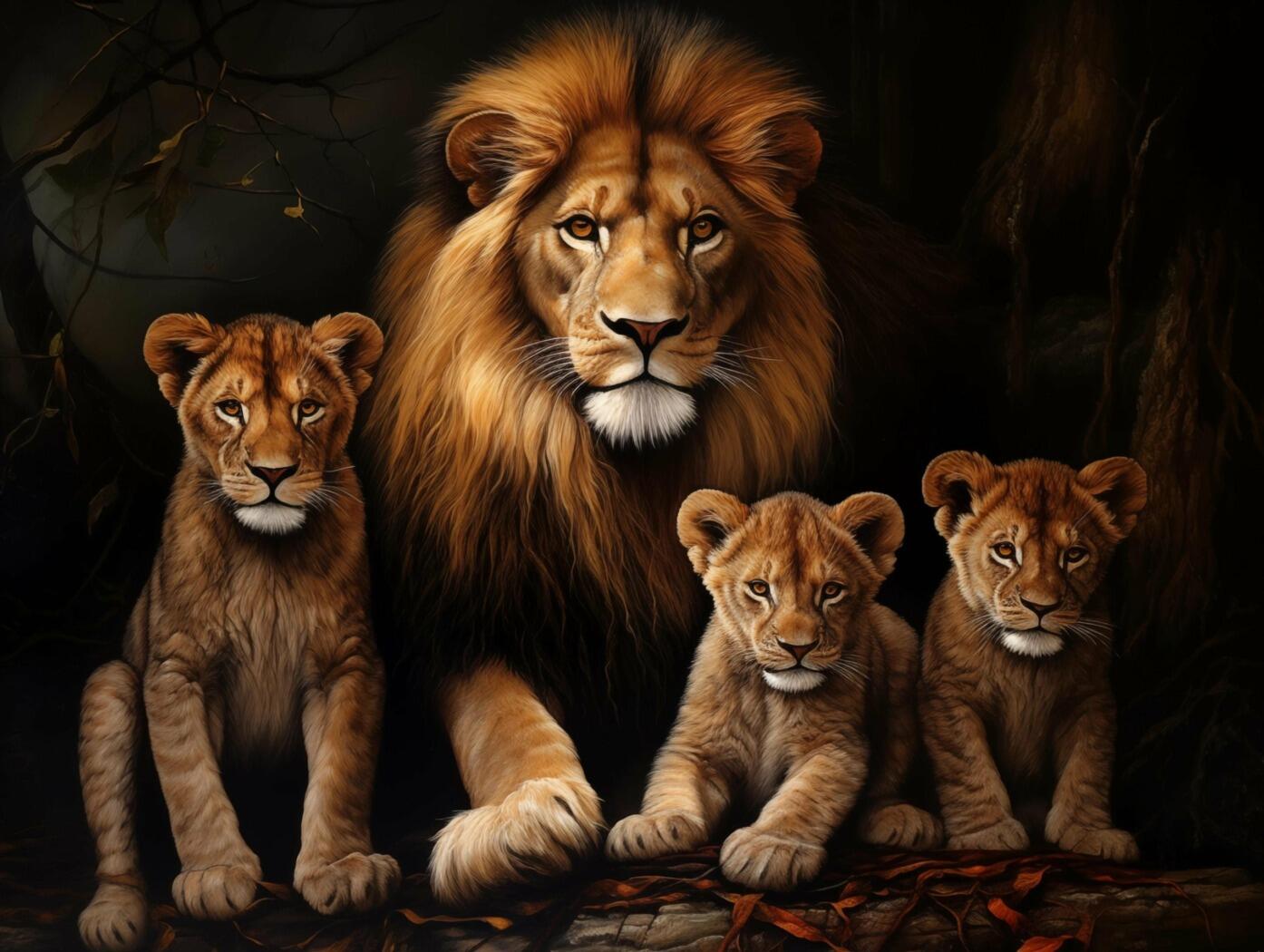 Glasschilderij – Exclusive – Liggend – Leeuwenfamilie 2 Welpen Sky