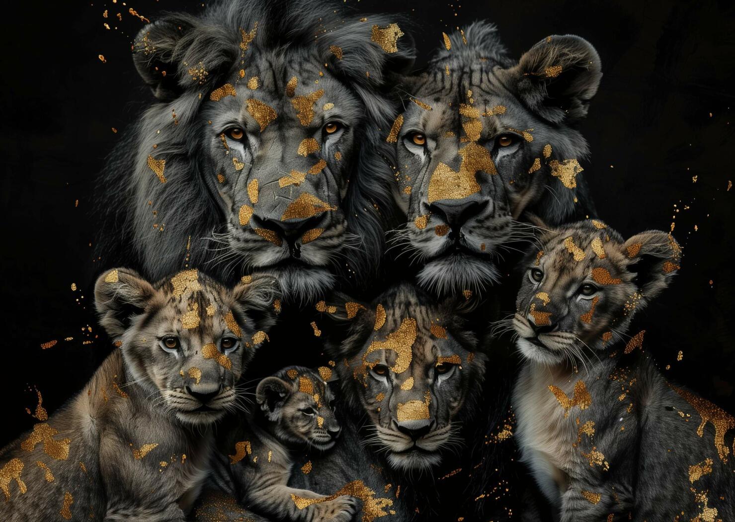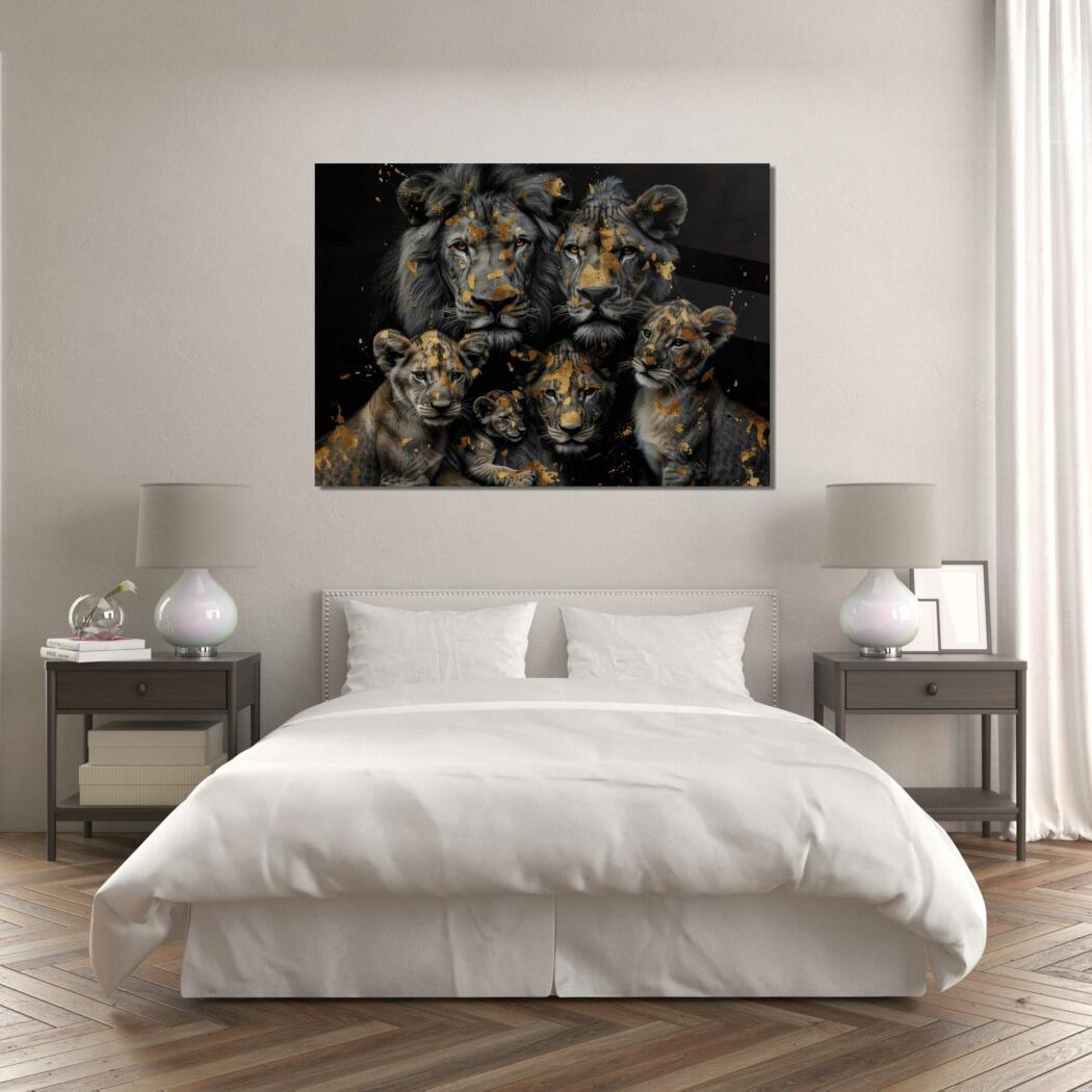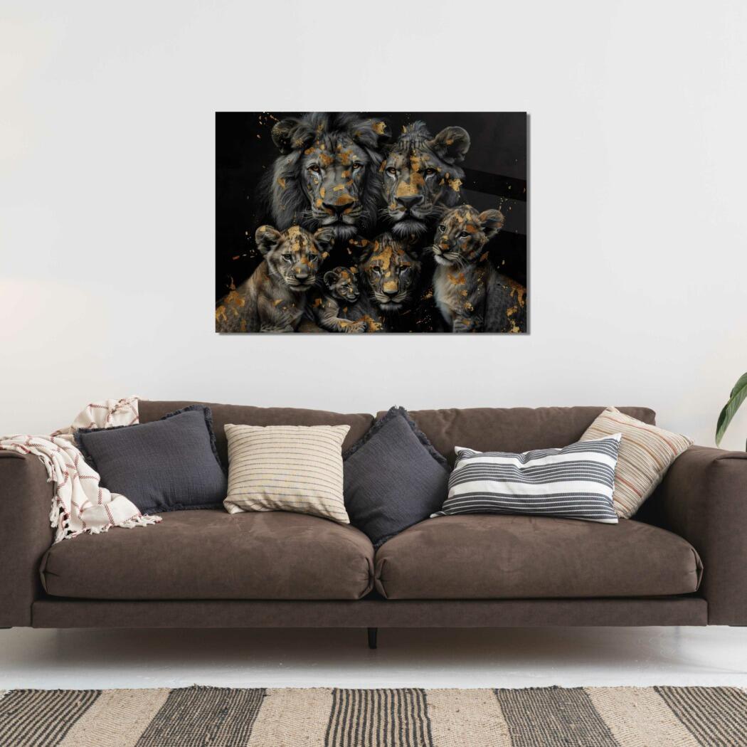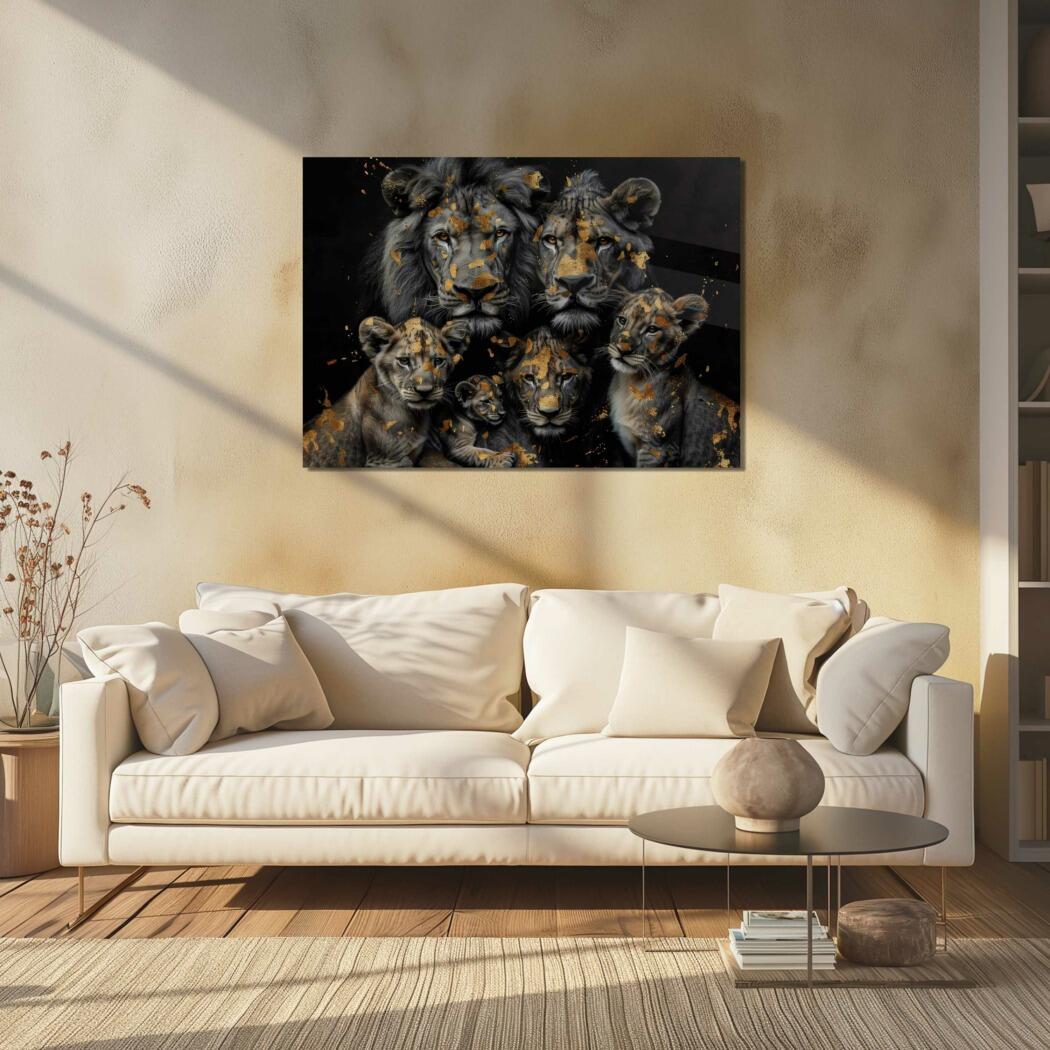 Glasschilderij – Exclusive – Liggend – Leeuwenfamilie 4 Welpen, Linden – Gouden Eeuw Serie