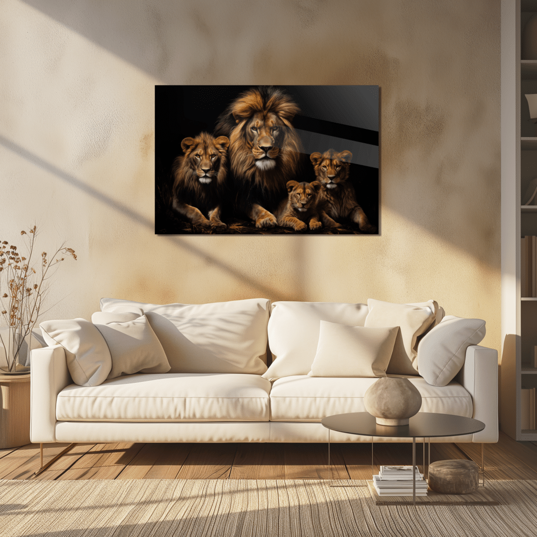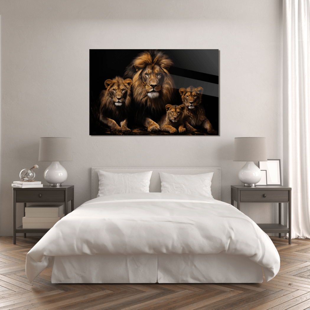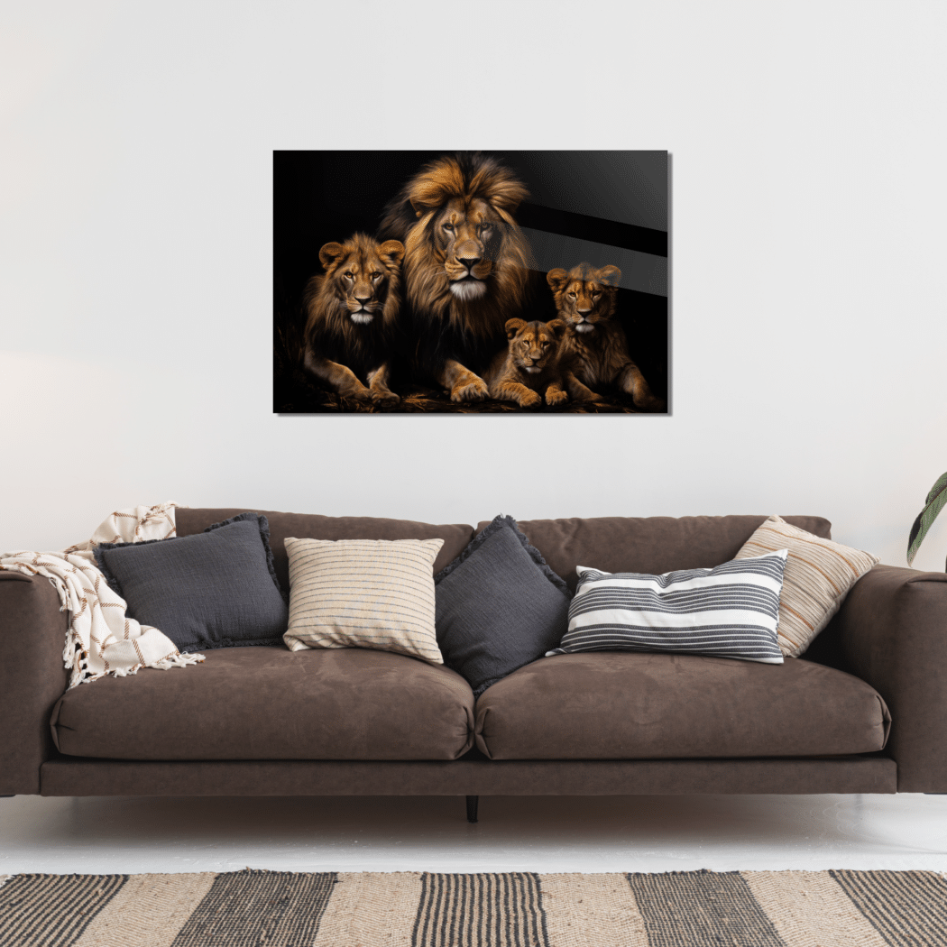 Glasschilderij – Exclusive – Liggend – Leeuwenfamilie 2 Welpen Wildernis