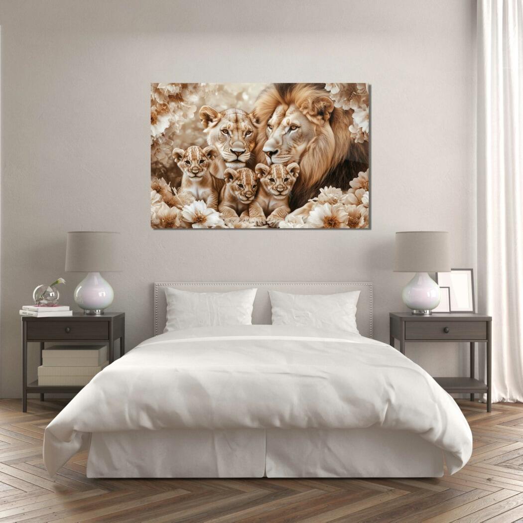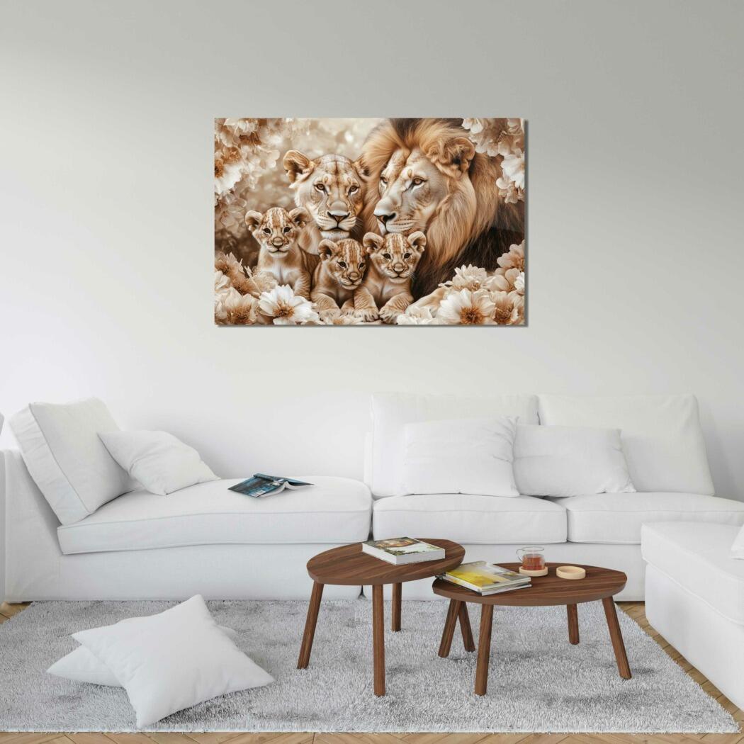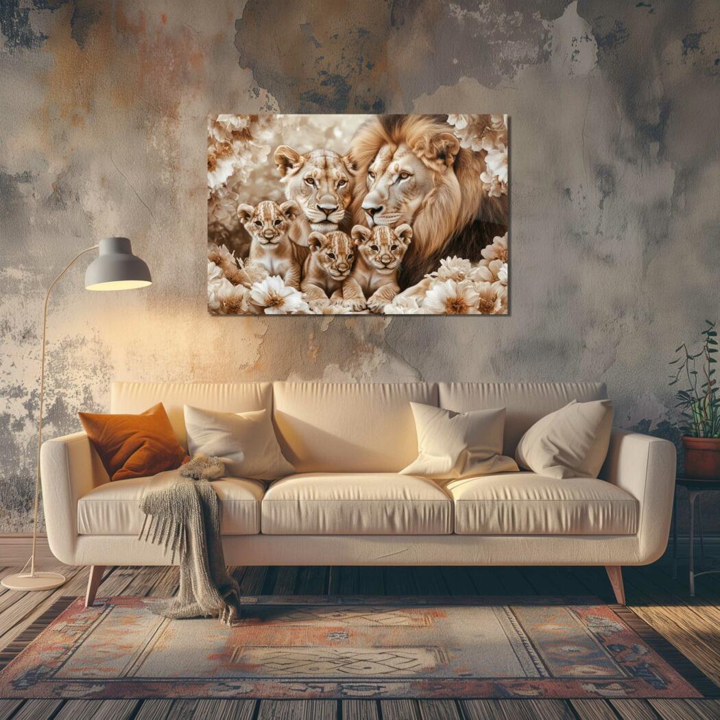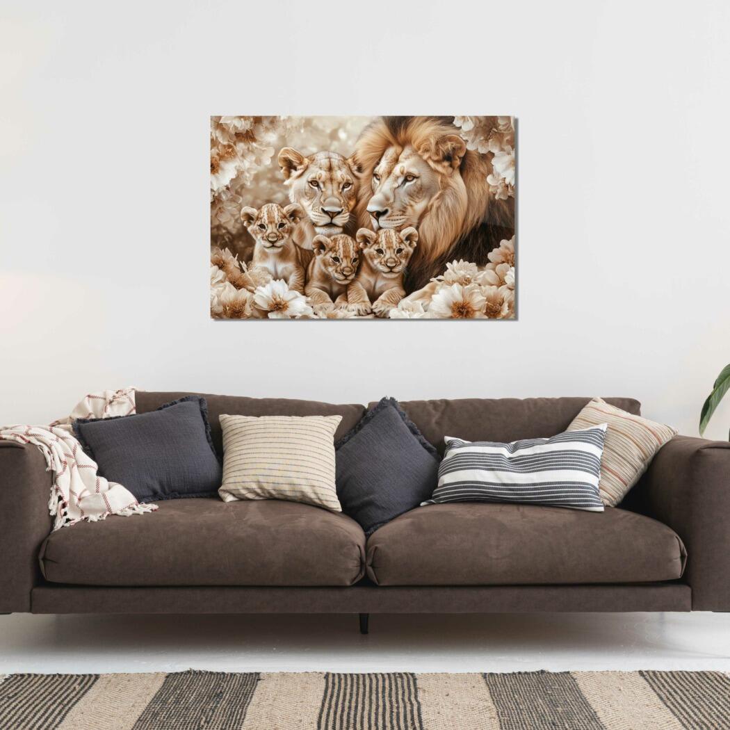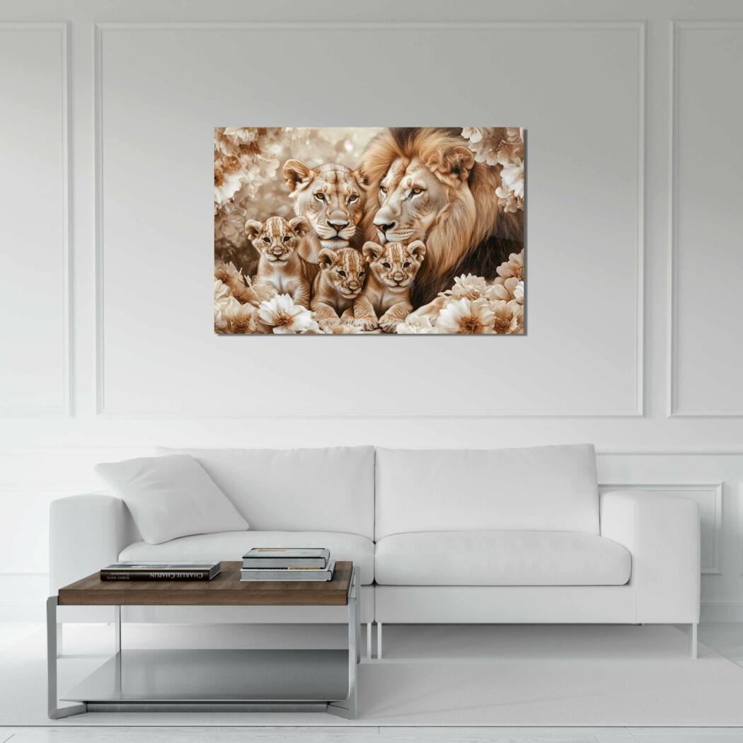 Glasschilderij – Exclusive – Liggend – Wabi Sabi Leeuwenfamilie 3 Welpjes – (Japandi Stijl)