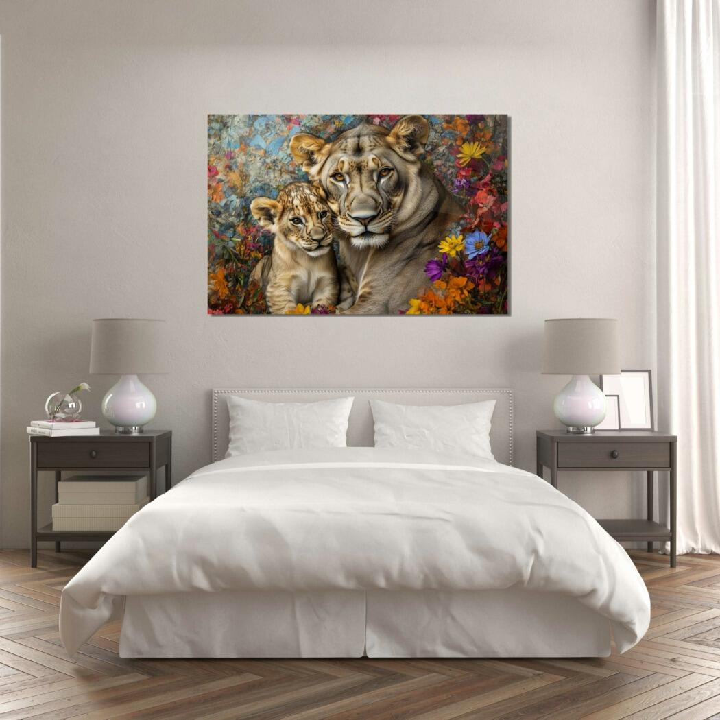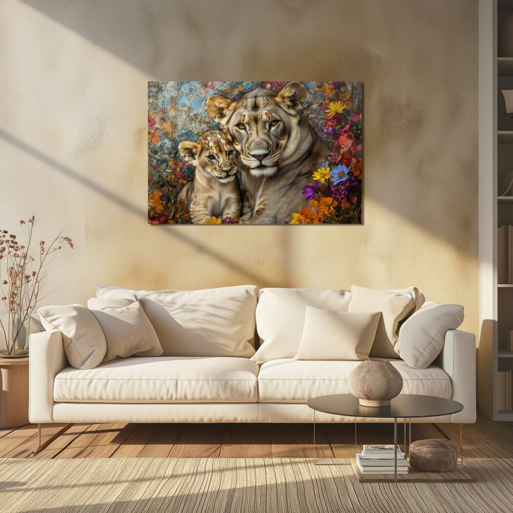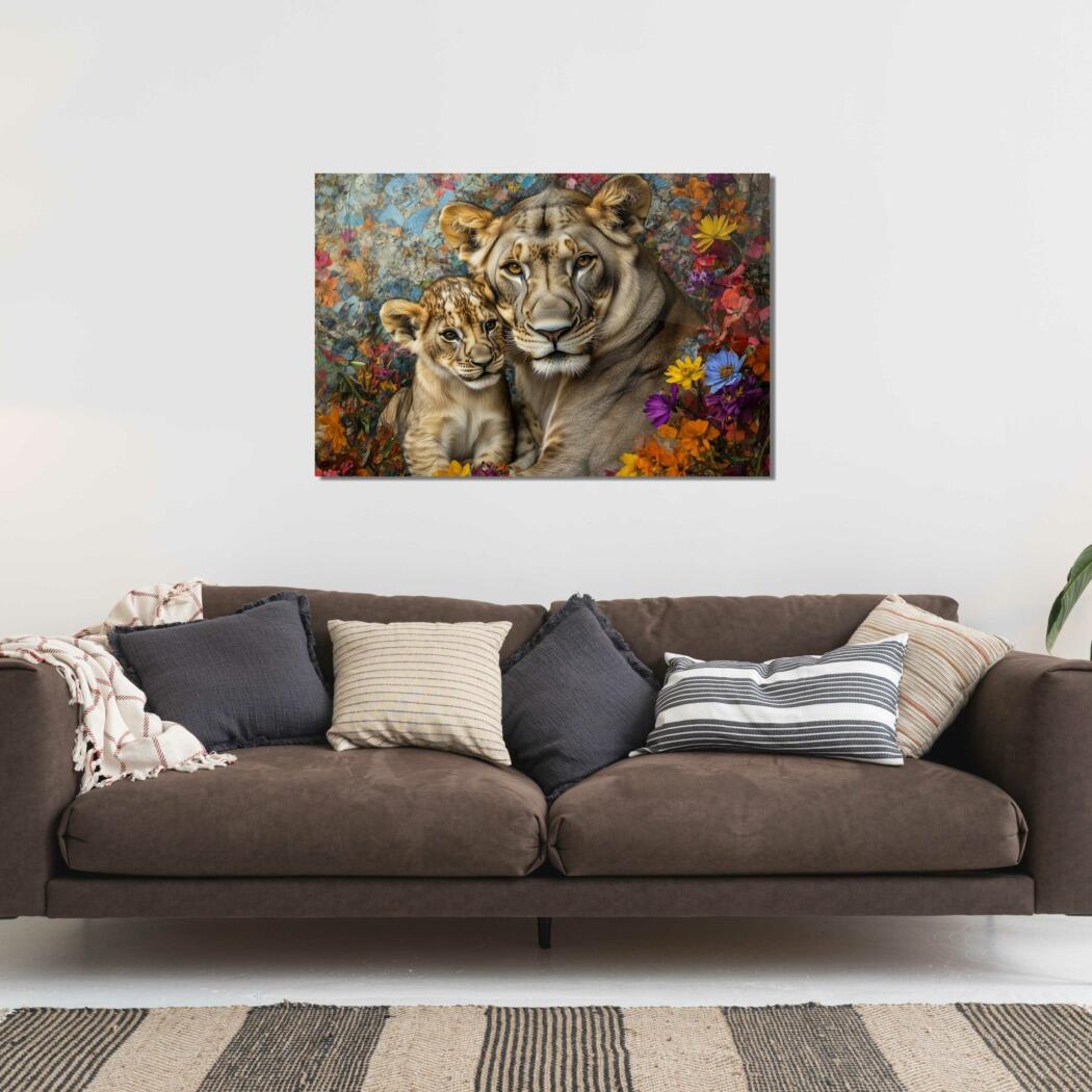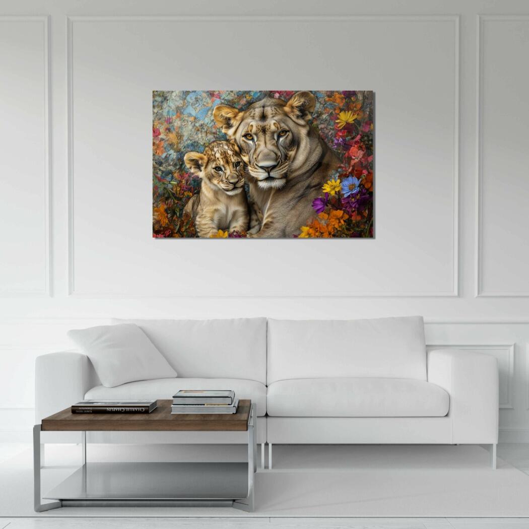 Glasschilderij – Exclusive – Liggend – Zandloper Leeuwenfamilie 1 Welp