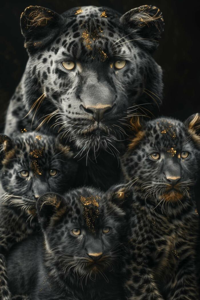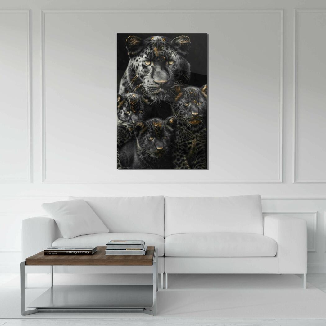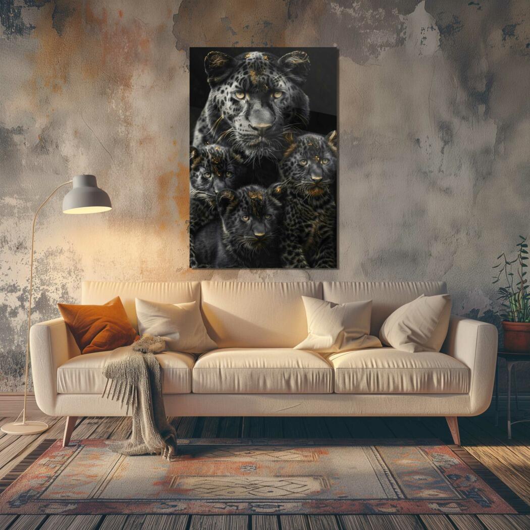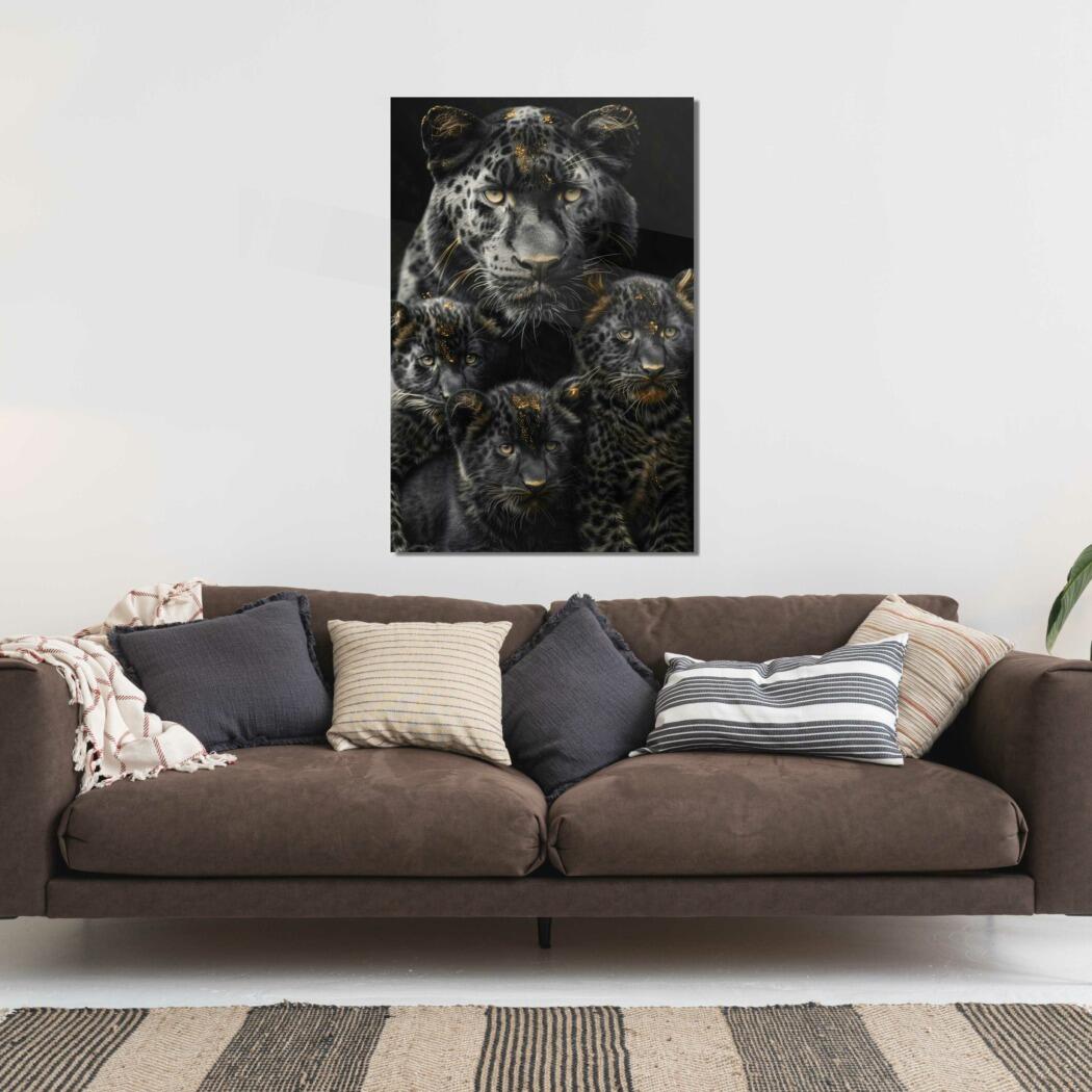 Glasschilderij – Exclusive – Staand – Panterfamilie 3 Welpen, Waakzaam – Gouden Eeuw Serie