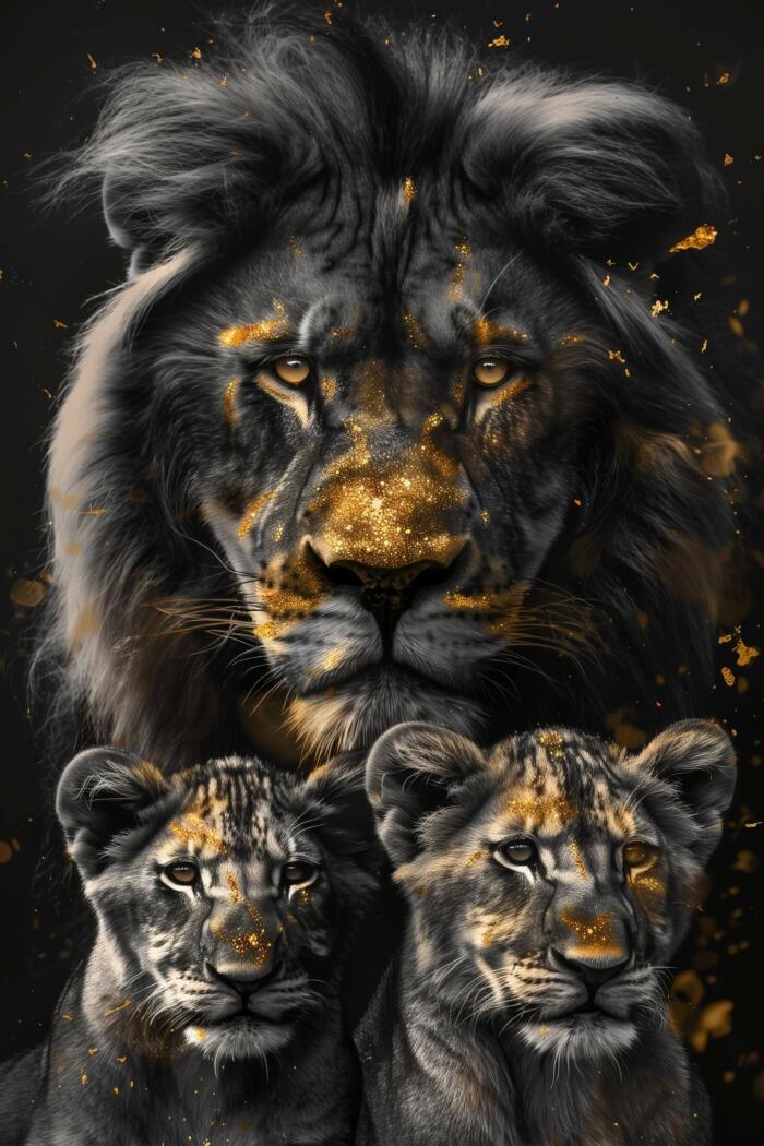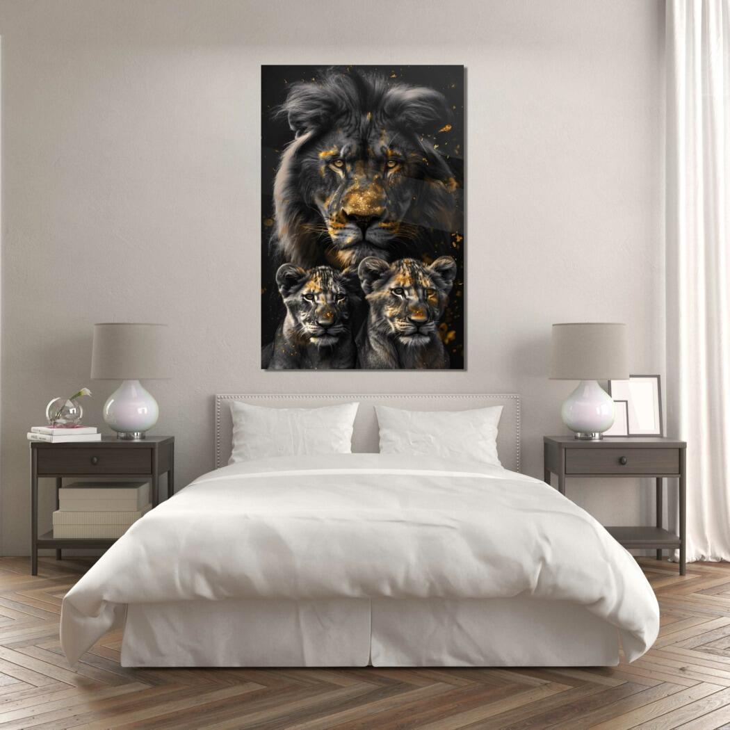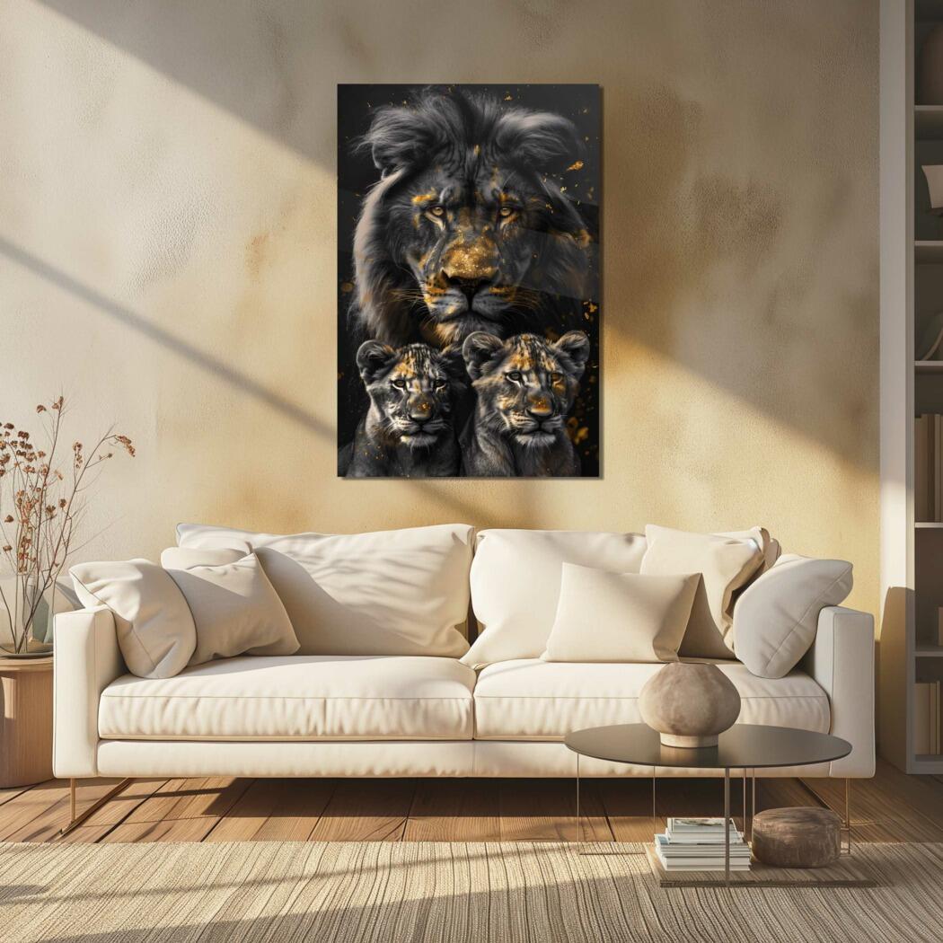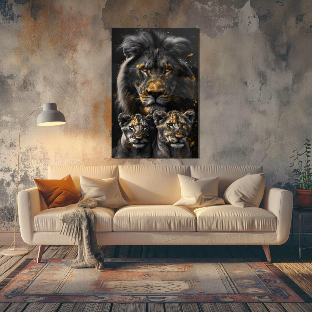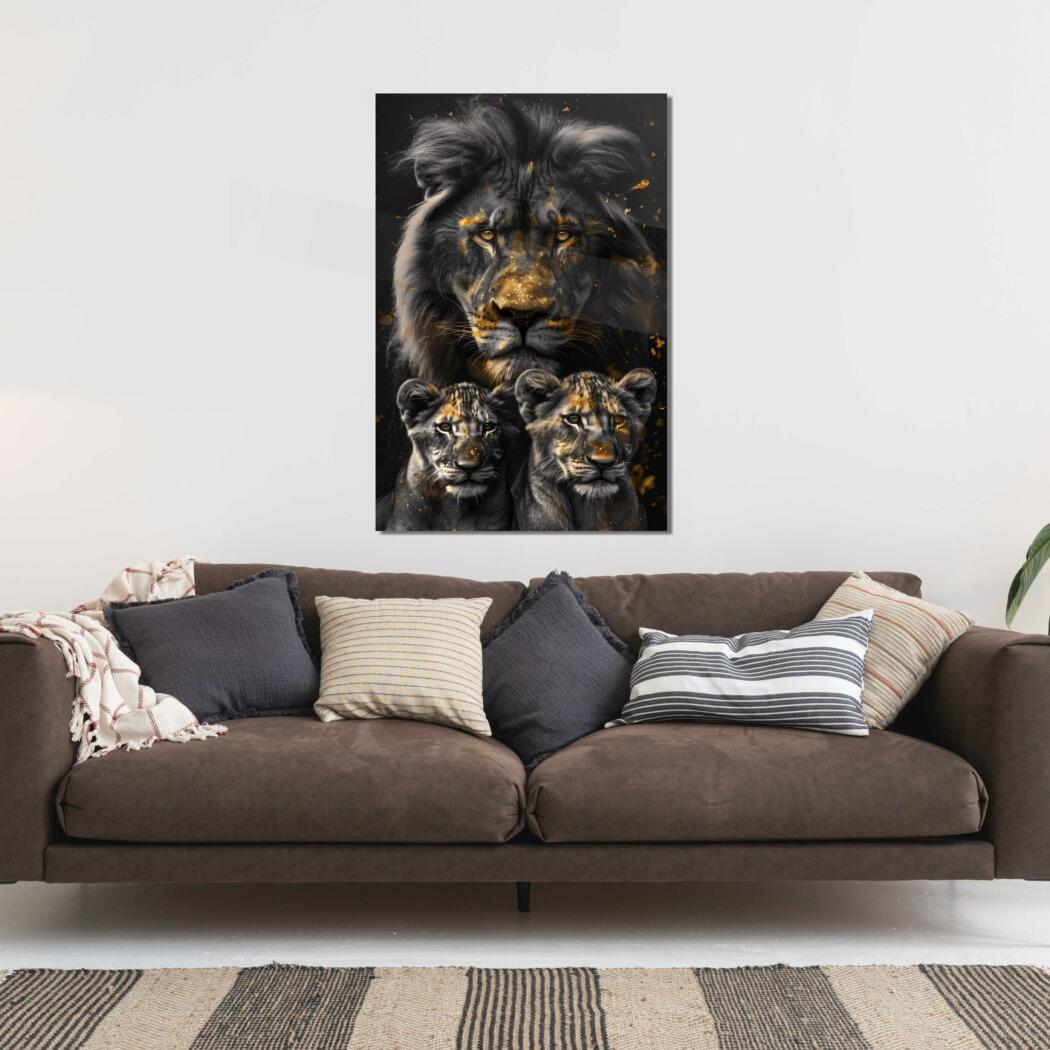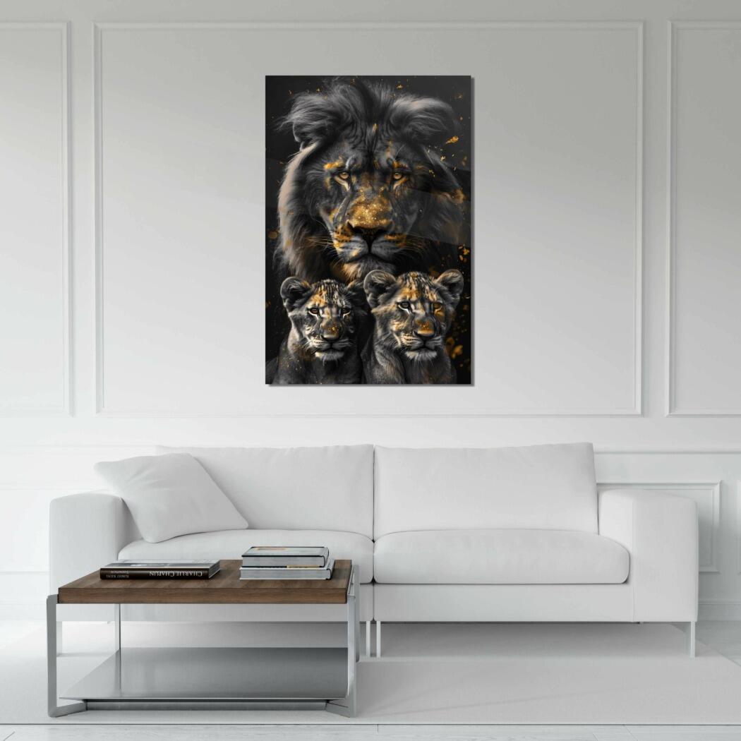 Glasschilderij – Exclusive – Staand – Leeuwenfamilie 2 Welpjes, Middernacht – Gouden Eeuw Serie